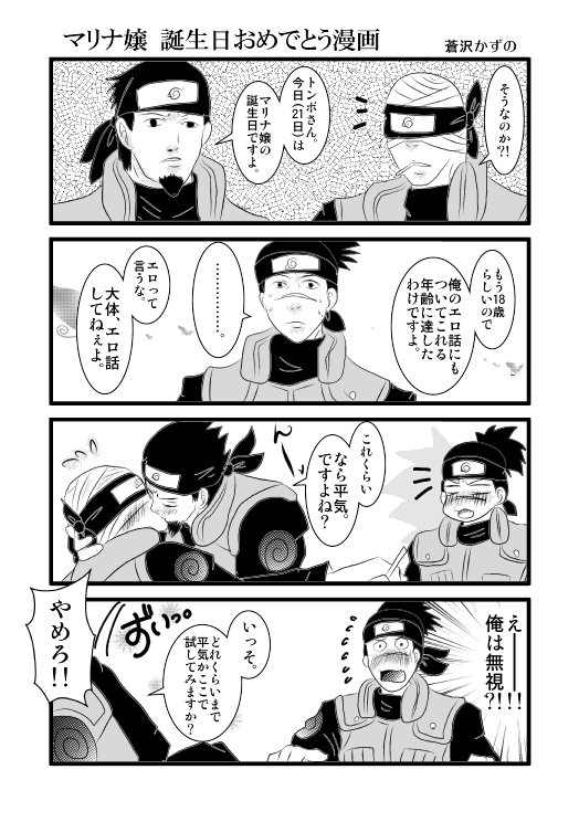 とにかく見てくだせぇこの漫画!! ウチがイルカさん好きだから、イワトンなのにイルカさんもいます!!(笑) にゃぁぁぁぁぁぁぁ!! どこまでも平気、いや寧ろこの時点で後ろにノックダウンしてしまいましたー!! ホント、マジで、見た瞬間後ろに倒れました。 けしからん! まずイワシさん!ウチに対してどこまで平気かなんて言い訳しといて実は単にトンボさんを抱きたいだけのくせに!ウチをだしにしてトンボさんを抱くとはけしからん!もっとやりなさい!! そしてマリナ様なんて呼ばないでよ!読んだ瞬間思わず目をそらしたよ!照れくさいよマジで! 次にトンボさん! ウチの誕生日を知らないのはまぁいいとして、あんた!もう少し抵抗というものをしなさい! いつも口ばかりが激しくて何もかもされるがままじゃないですか! ウチを出血多量で殺す気ですか!! そして・・・、1番けしからんのはイルカさんだー!! なんだよ! 俺は無視?!って、何かされたかったのかよ!? あんたのその台詞で倒れたんだよウチは! けしからん!けしからんすぎるぞこれは! ライドウ苛めをしてる場合ではないぞこれは!いやもちろんするけど! イルカさんも苛めなければ!! よしよし待て待て、イルカさんのこの後はきっとこうだ。 「(この空間に俺を攻めてくれる人はいない・・・ここは・・・ッ)」 と走り去り、カカシさんの元へ。 そしてカカシさんを見るなり こうだ! 「・・・ぇ!?イルカ先生・・・ッ!?」 「黙ってやられててください!」 「・・・・・はい・・・」 有無を言わせぬ言葉でカカシさんを黙らせて、攻めてもらおうと思ったのに結局攻めになってるイルカさん。 こんな感じかな・・。 このイルカさんはきっと、『受けになりたい攻め』だ。 カカシさんはきっと『攻めになれない受け』だ。 最後に、かずのん!あなたもけしからん! こんな漫画をまたも不意打ちでくれちゃって、ウチは倒れるわ色々な妄想が繰り広げられるわで、 誕生日早々死ぬとこでしたよ!! 大体、ウチの萌えツボをクリーンヒットしちゃってるんですよ! *イルカさん! *イワシさんとトンボさん! *チューの仕方! *放置プレイ! *それを真っ赤な顔で嫌がる! 見事でした。 ホント見事にやられました。これから開くたびににやける事でしょう。 大事に大事にします! そんな、ウチを出血多量(どこからのかは言わない)で殺そうとした蒼沢かずのさんのサイトにはリンクから飛んでいってください!! まったくホントにけしからん。 ご馳走様でした!!! PR