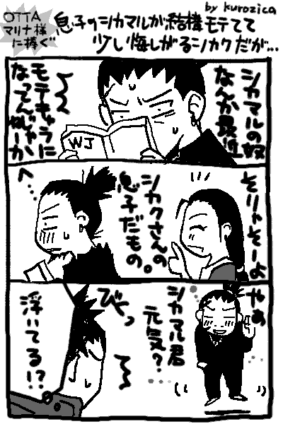 やっほーぃ♪ ウチの出したリクは、『息子のシカマルが結構モテてて少し悔しがるシカクだが…』 で、続きは想像にお任せ!ということで楽しみに待ってました(>∀<*) そしてついに・・!! 父さんは鼻が高いぞ。って心の内で思ってそうだ・・・!!! っていうか・・・・シカクさん可愛いぞぉぃ! 悔しがるのはリク通りだけどさ、 そのあとヨシノさんに褒められてポッてなるし、やっぱりか?みたいな感じで浮いてるし・・・! いやぁ、可愛い!!あの、絶対シカクさんもモテてるから! 息子の事だけで満足しないようにね!! いやもうホント素敵。いつもうわー、な妄想でにやけていたけど、今回のこの絵は純粋にほほえましかったです。 ホントに、kuroちゃんの描く奈良親子漫画とかが凄くほほえましくて好きです。 ライ誕祝い祭でも、ライドウさん可愛い!って思うのだけど、それ以上にチビマルが可愛い!!って思うのですよ!! どうしてあんなに可愛く描けるのだ!って思うのですよ! で、ライシカがどうしても描きたくなった自分(笑) 現在製作中です(^^) とにかく、kuroちゃんのサイトはこんな可愛くて微笑ましくて超可愛い漫画がたくさんありますので是非リンクから飛んで行ってくださいね!(≧∀≦) PR